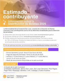 CIUDAD DE SAN JUAN | SUSANA LACIAR INTENDENTE Estimado contribuyente: Información sobre la Distribución de Boletas 2025 La Municipalidad de la Ciudad de San Juan, a través de su Dirección de Rentas, informa a los contribuyentes acerca de las diferentes modalidades para la obtención de las boletas: Disponibles para descargar desde la web oficial: www.municipiosanjuan.gob.ar Se podrán solicitar por correo: rentas@municipiosanjuan.gob.ar Podrán retirarse de manera personal por el Área de Rentas. De lunes a viernes, de 7:30 a 13:30 horas. Durante los meses de febrero y marzo, se ampliará la atención en el horario de 16:00 a 19:00 hs. A fin de optimizar recursos, se comunica que no se distribuirán boletas a domicilio. Calendario de Vencimientos 2025 El calendario de vencimientos para el año 2025 es el siguiente: Primer Semestre o anual: Vence 31 de marzo de 2025 Pago del Segundo Semestre: Vence 31 de julio de 2025 Anticipo 1° cuota (Enero), 2° cuota (febrero), 3 cuota (marzo): Vencen 31 de marzo de 2025 Resto de vencimientos disponibles en la web municipal. Lugares de Pago A través de la web municipal. Entidades habilitadas: Banco San Juan, San Juan Servicios, Plus Pagos, Pago Fácil, Rapipago, Banelco, Link, Lotipago y Cobro Express. ¡BUENA GENTE, BUENAS COSTUMBRES!