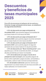 ```html Descuentos y beneficios en el pago de tasas municipales 2025 La Municipalidad de la Ciudad de San Juan anuncia una serie de medidas destinadas a reconocer el esfuerzo de los vecinos y fomentar el pago anticipado de las tasas correspondientes al período 2025. A continuación, se detallan los beneficios establecidos: Descuento del 15% por pago anticipado de Anualidad 2025 Aplica a quienes cancelan la totalidad de sus tasas anuales hasta el 31 de marzo de 2025. Descuento del 10% por pago anticipado del 1° semestre 2025 Para quienes abonen el primer semestre de sus tasas antes del 31 de marzo de 2025. Descuento del 10% por pago anticipado del 2° semestre 2025 Dirigido a quienes cancelen el segundo semestre de sus tasas hasta el 31 de julio de 2025. Descuento del 10% por “Buen Contribuyente” Beneficio aplicable a vecinos que, al 30 de noviembre de 2024, no posean deudas pendientes en tasas municipales. Compensación del 10% por pago online Para aquellos que efectúen el pago anual, semestral o mensual a través de la plataforma web municipal, sobre el valor nominal de la tasa. Beneficio adicional del 5% Exclusivo para quienes hayan regularizado sus tasas hasta el 31 de marzo de 2024, sin haber adherido a ningún sistema de moratoria. Conclusiones Estos incentivos buscan premiar la conducta responsable de los contribuyentes y promover el cumplimiento en el pago de las obligaciones municipales. Para mayor información y consultas sobre los requisitos específicos de cada modalidad, los interesados pueden acercarse a la Dirección de Rentas de la Municipalidad de la Ciudad de San Juan o visitar los canales oficiales de atención en línea. Visite nuestro sitio web para más información BUENA GENTE, BUENAS COSTUMBRES!! ```