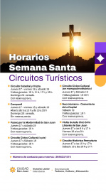 Viví Semana Santa en la Ciudad de San Juan Disfrutá de propuestas culturales únicas con horarios especiales y actividades que se mantienen todo el año. Propuestas culturales y recreativas La Municipalidad de la Ciudad de San Juan invita a disfrutar de una variada agenda de actividades culturales y recreativas durante el fin de semana largo. Con recorridos guiados, paseos al aire libre y visitas patrimoniales, la Ciudad ofrece experiencias para todas las edades. Detalle de las propuestas A continuación, compartimos el detalle de las propuestas, con días y horarios especiales para este fin de semana: Circuito Catedral y Cripta Jueves 17, viernes 18 y sábado 19 Visitas guiadas: 10:00, 11:00, 17:00 y 18:00 Domingo 20: cerrado Con reserva previa Campanil Jueves 17, viernes 18 y sábado 19 Abierto de 9:00 a 13:00 y de 16:00 a 20:00 Domingo 20: cerrado Sin reserva previa Paseo por la Modernidad de San Juan Jueves 17 y sábado 19 Visitas guiadas: 10:00 Con reserva previa Circuito Cívico Cultural (a pie) Jueves 17 y sábado 19 Visitas guiadas: 18:00 Con reserva previa Circuito Cívico Cultural (en monopatín eléctrico) Jueves 17 y sábado 19 Visitas guiadas: 16:30 Con reserva previa Necroturismo - Cementerio de la Ciudad de San Juan Sábado 19 Visitas guiadas: 16:00 Con reserva previa Visita guiada Club Sirio Libanés Jueves 17, a las 9:00 y a las 17:00 Viernes 18, a las 9:00 Con reserva previa Circuito Histórico Ferroviario Jueves 17, a las 10:00 y a las 17:00 Sábado 19, a las 10:00 y a las 17:00 Las actividades con reserva pueden gestionarse vía WhatsApp al 264 6317574 (Secretaría de Cultura, Turismo y Educación de la Ciudad de San Juan). BUENA GENTE, BUENAS COSTUMBRES!!