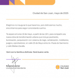 CIUDAD DE SAN JUAN Juntos transformamos la Ciudad Se trata de una nueva obra urbana que mejora la calidad de vida de los vecinos. Desde la Municipalidad de la Ciudad de San Juan elegimos no inaugurar lo que hacemos, pero sí celebrar cada paso que da forma a una ciudad más inclusiva, segura y moderna. Por eso, te invitamos a acompañarnos este lunes 19 de mayo, a partir de las 19:00, para compartir la concreción de una nueva obra de transformación urbana. Esta intervención incluye pavimento, nueva iluminación, parquización con cisterna de riego, señalización, mobiliario urbano, juegos y ejercitadores en el tramo de calle 25 de Mayo, entre Av. Paula de Sarmiento y calle Matías Zavalla. Te esperamos para seguir construyendo juntos los sueños de nuestra Ciudad.