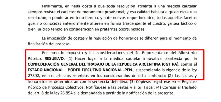 Urgente La Justicia falló a favor de la CGT y suspendió la aplicación de más de 80 artículos de la ley. El juez laboral Raúl Ojeda hizo lugar a la medida cautelar solicitada por la central sindical y dejó en suspenso disposiciones clave de la Ley 27.802 por considerar que existen indicios serios de inconstitucionalidad y riesgo de daños irreparables. Más noticias La CGT conmemoró el hito de la movilización bajo la consigna "Paz, Pan y Trabajo" a 44 años del 30 de marzo, marcando un momento crucial en la historia sindical de Argentina. Fallo de la Justicia Nacional El Juzgado Nacional del Trabajo N° 63, a cargo de Raúl Ojeda, resolvió hacer lugar a la medida cautelar presentada por la Confederación General del Trabajo y suspender la aplicación de más de 80 artículos de la reforma laboral, al considerar que hay indicios suficientes de inconstitucionalidad y peligro en la demora. Alcance de la medida judicial En la resolución, el magistrado dispuso la suspensión provisoria de los artículos cuestionados hasta que se dicte sentencia definitiva. Se prevé que la entrada en vigencia de la reforma podría generar efectos jurídicos y materiales irreversibles en las relaciones laborales. Artículos suspendidos La cautelar afecta un amplio conjunto de disposiciones que modifican normas del derecho laboral. Entre los artículos suspendidos se encuentran: Artículos que modifican el ámbito de aplicación de la legislación laboral y la figura de trabajadores de plataformas. Suspensión del Título II respecto a los Fondos de Asistencia Laboral. Artículos que alteran cambiando las condiciones de huelga y jornada laboral. Fundamentos del juez El magistrado enfatizó que las reformas podrían derivar en una regresión de los derechos laborales, afectando principios constitucionales como la protección del trabajo y la libertad sindical. Próximos pasos La suspensión es provisional y se mantendrá hasta que se resuelva el fondo de la cuestión. Las disposiciones cuestionadas no podrán aplicarse, lo que implica que continuarán vigentes las normas anteriores en contratación, negociación colectiva y organización sindical.